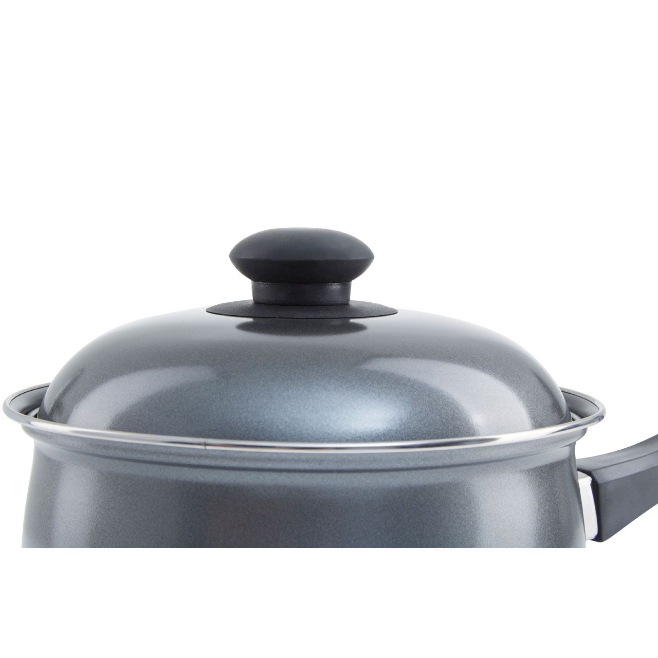 The modern five piece non-stick carbon steel dark silver cookware set with Bakelite handles, containing 14cm milkpan, 16/18/20cm saucepans and 24cm frying pan is a great addition to your kitchen. Equip your kitchen with the attractive five piece dark silver cookware set. The set includes a milk pan, three saucepans with lids and a frying pan for all your cooking needs. The carbon steel cookware is stylish as well as durable and efficient. A non-stick layer ensures that you can use less oil and the cookware is easy to clean. The Bakelite handles provide heat resistance. A great starter set or gift; the cookware set is ideal for those wanting to modernise their kitchen.