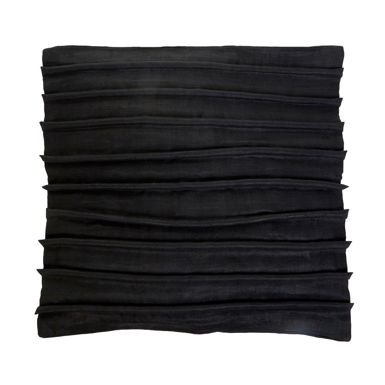 A contemporary large square floor cushion cover made from soft black fabric. A trio of large round buttons are stitched into the rear side of this cushion, with fabric loop fasteners opposite that keep it closed when a cushion is inserted. Their sleek black colour matches the cover's fabric. Its face side is tucked and stitched to create a series of lateral folds that add texture to its surface.