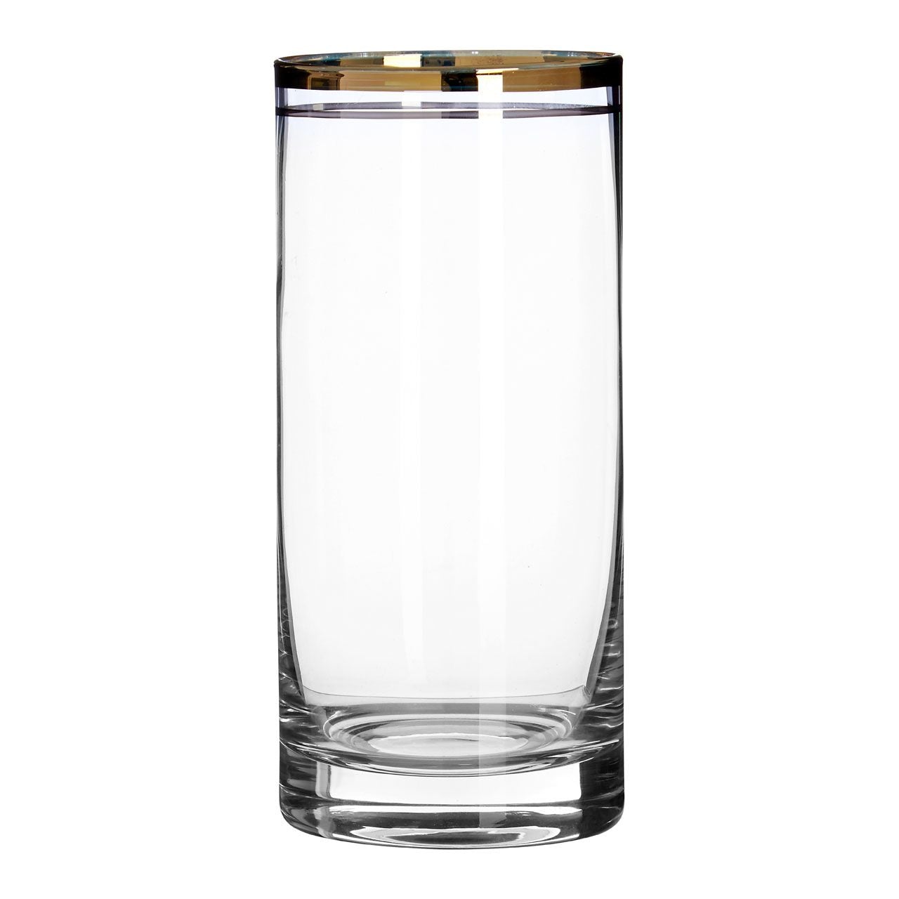 This set of four highball glasses is great for serving cocktails and other tall drinks. These slim and elegant glasses are notable for the gold and silver lines that trim their rims. Each glass is hand blown, enhancing the desirability of this beautiful, and highly giftable, drinkware set. Coordinate them with tumblers and wine glasses from the Charleston range to create a matching set.