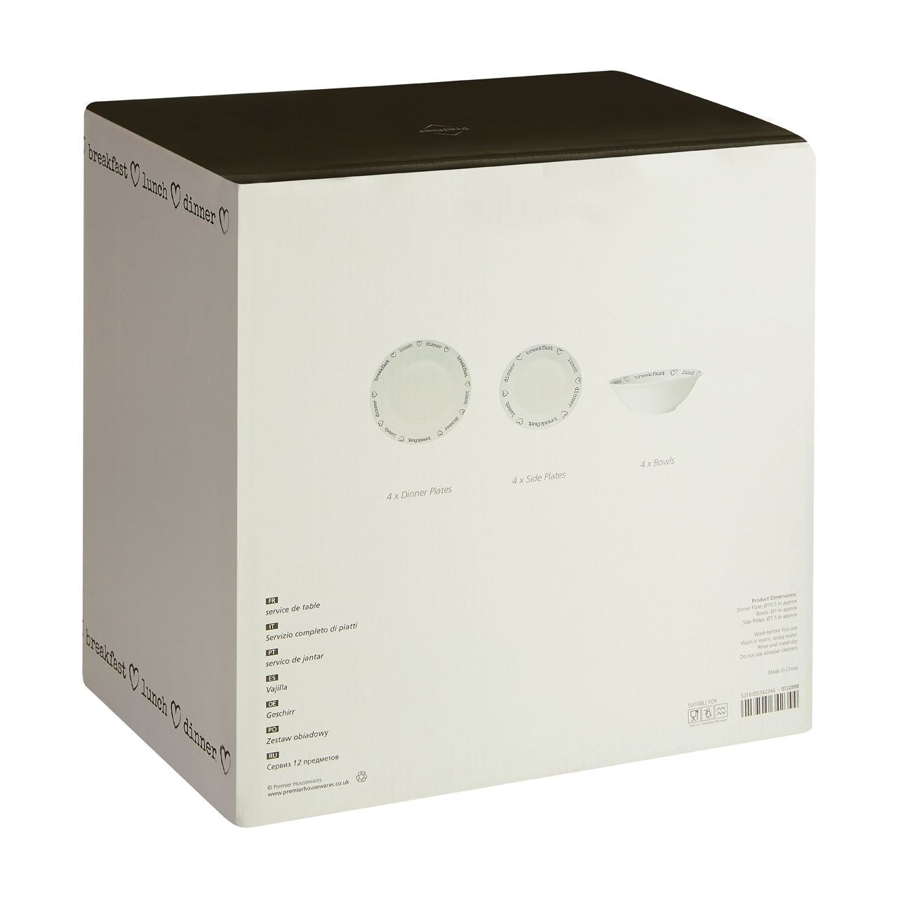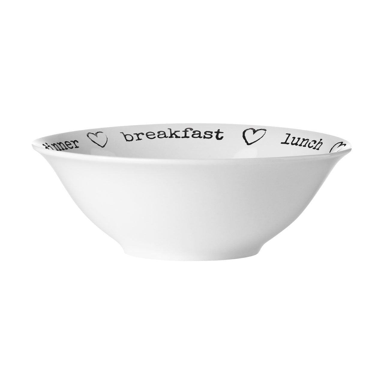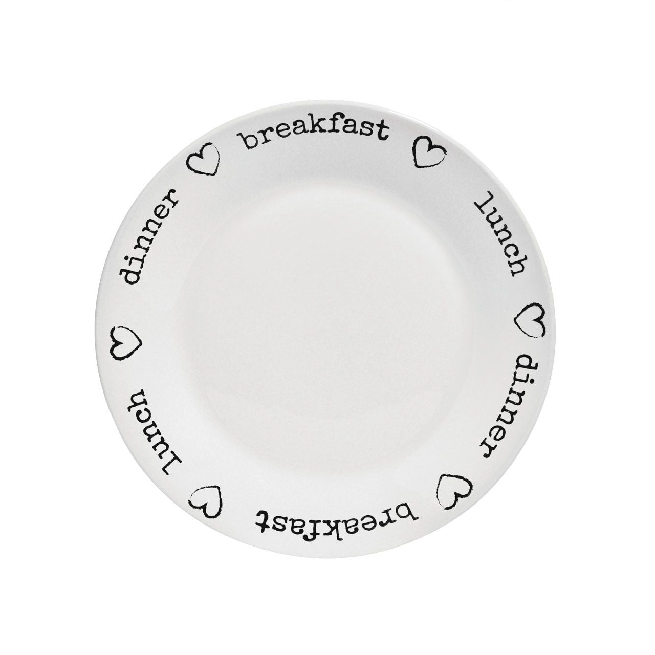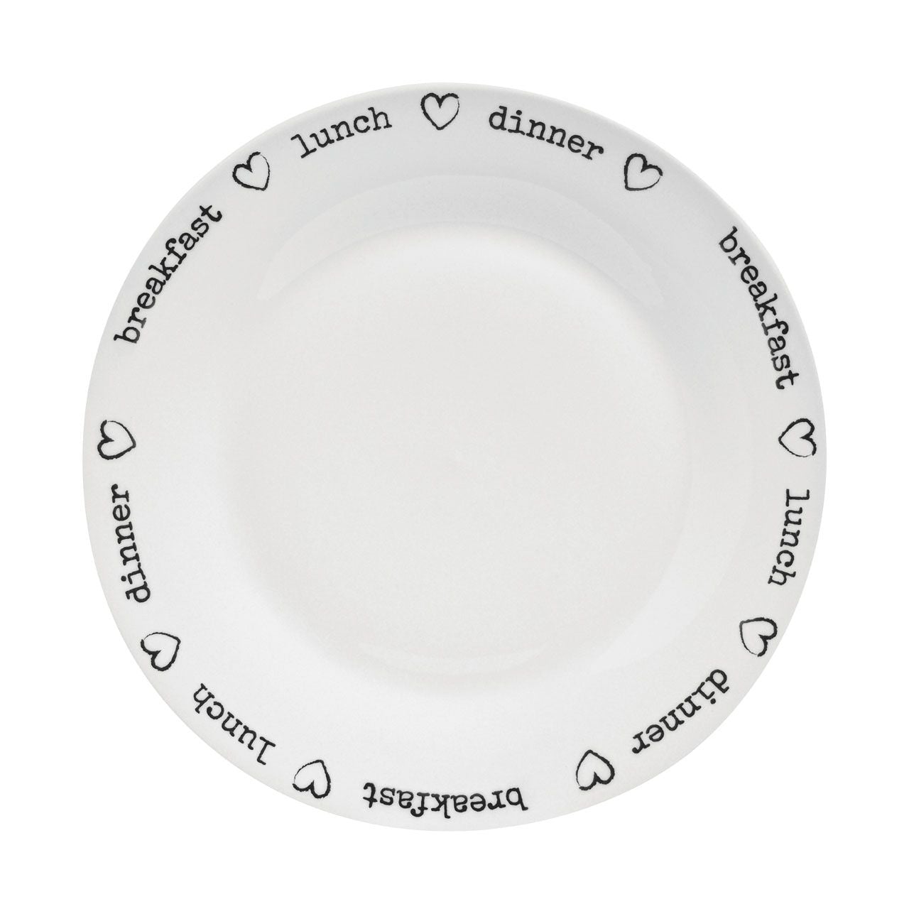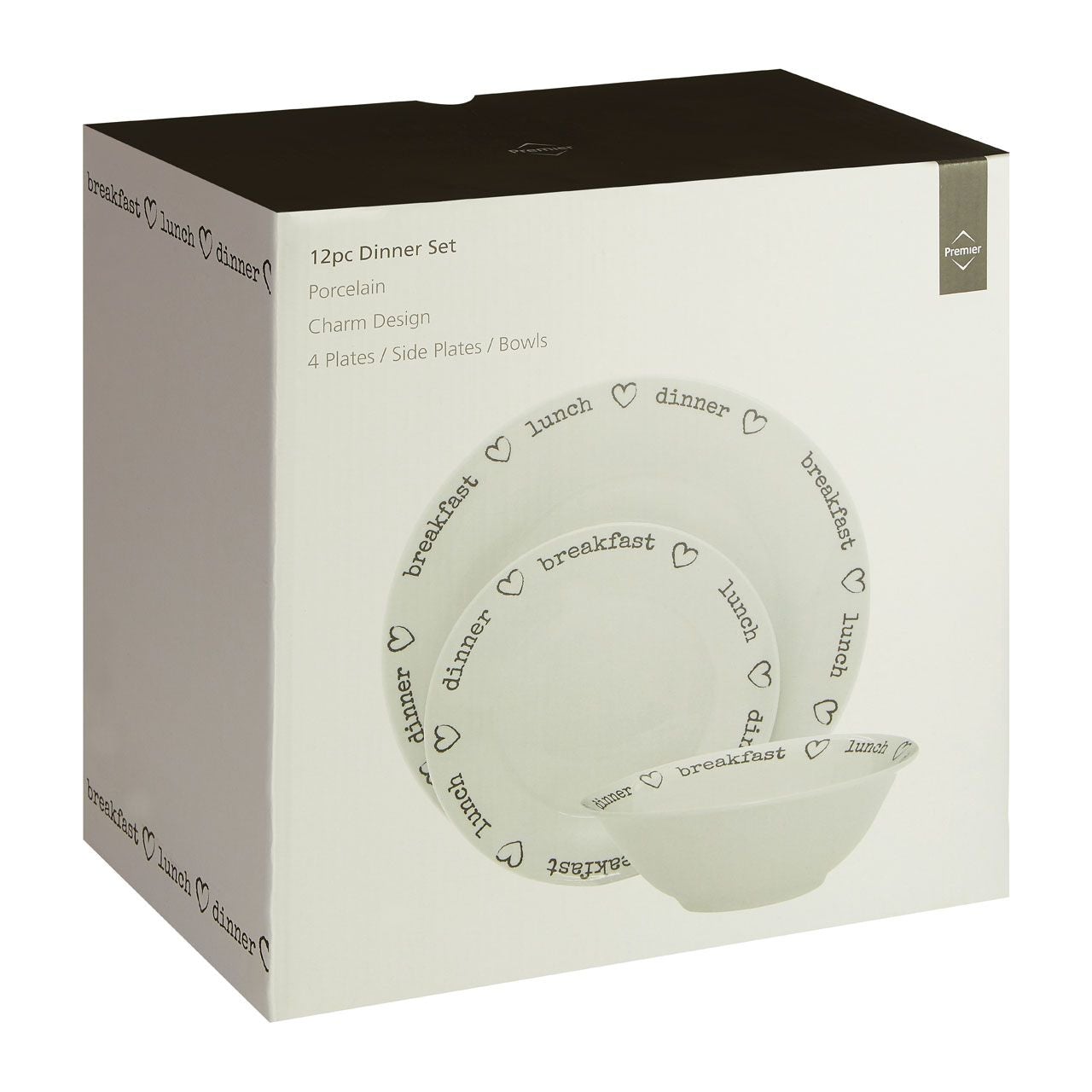 Adding some chic to your table, the 12pc Charm dinner set is ideal for everyday dining whether it's breakfast, lunch or dinner. Included in the set are 4 x dinner plates, 4 x side plates and 4 x bowls. Each is made from durable white porcelain and feature worded 'breakfast', 'lunch' and 'dinner' detail and love hearts in black for an elegant look. The smooth surface is easy to clean in warm soapy water, making it ideal for everyday use. The full set ensures you can enjoy starters, mains and desserts up to four people. Adding a sense of occasion to your meal, the contemporary Charm dinner set will become an everyday delight each time you sit down for a meal.