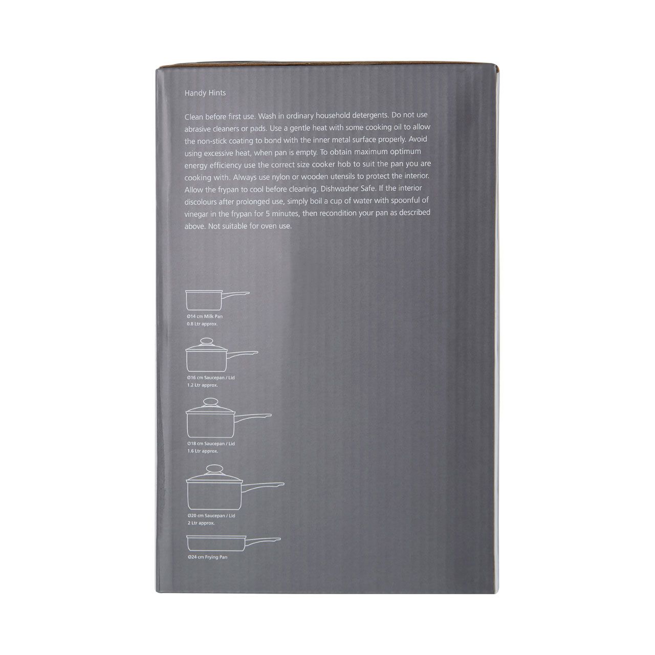 The modern five piece non-stick carbon steel dark silver cookware set with Bakelite handles, containing 14cm milkpan, 16/18/20cm saucepans and 24cm frying pan is a great addition to your kitchen. Equip your kitchen with the attractive five piece dark silver cookware set. The set includes a milk pan, three saucepans with lids and a frying pan for all your cooking needs. The carbon steel cookware is stylish as well as durable and efficient. A non-stick layer ensures that you can use less oil and the cookware is easy to clean. The Bakelite handles provide heat resistance. A great starter set or gift; the cookware set is ideal for those wanting to modernise their kitchen.