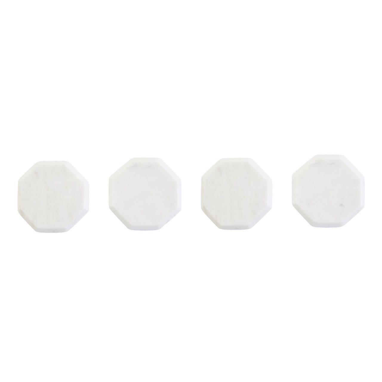 Classic set of four white marble octagonal coasters. This set of four white marble octagonal coasters are a great way to elevate a modern space, with the shape giving an extra modern edge.