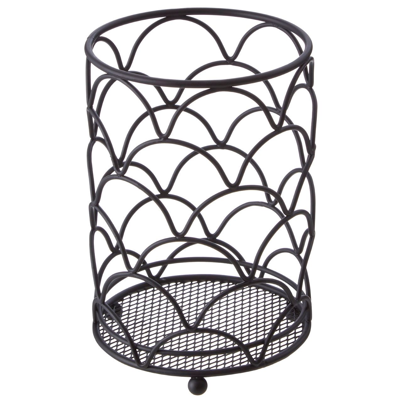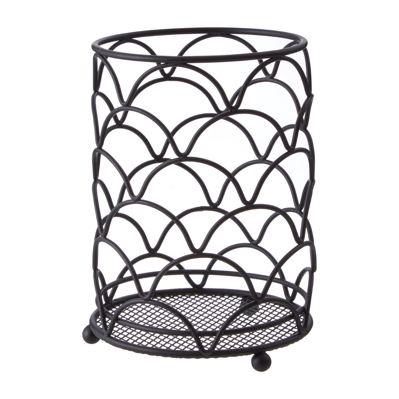 A stylish kitchen essential, this utensil holder features wireframe openwork and neatly stores cooking tools to keep the worktop tidy. The Vertex Deco matte black finish utensil holder has decorative, rounded sides designed on art deco accent. Finished with a matching mesh base, it is complemented by ball feet at the bottom which maintain its stability.