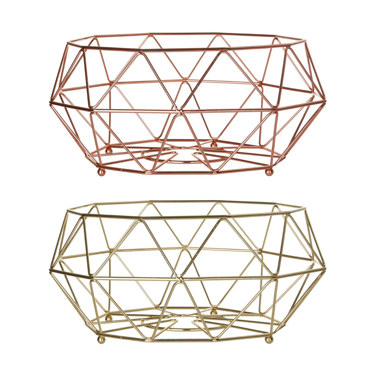 This contemporary fruit basket uses slim wires to create a distinctive geometric lattice. Made from strong iron, this fruit basket's minimalist wireframe construction benefits from a warm gold finish. Its geometric design results in two layers of triangles which combine to form a polygonal bowl shape. The tapered design allows it to hold fruit securely. Small rounded feet raise it from the surface of the table or worktop.