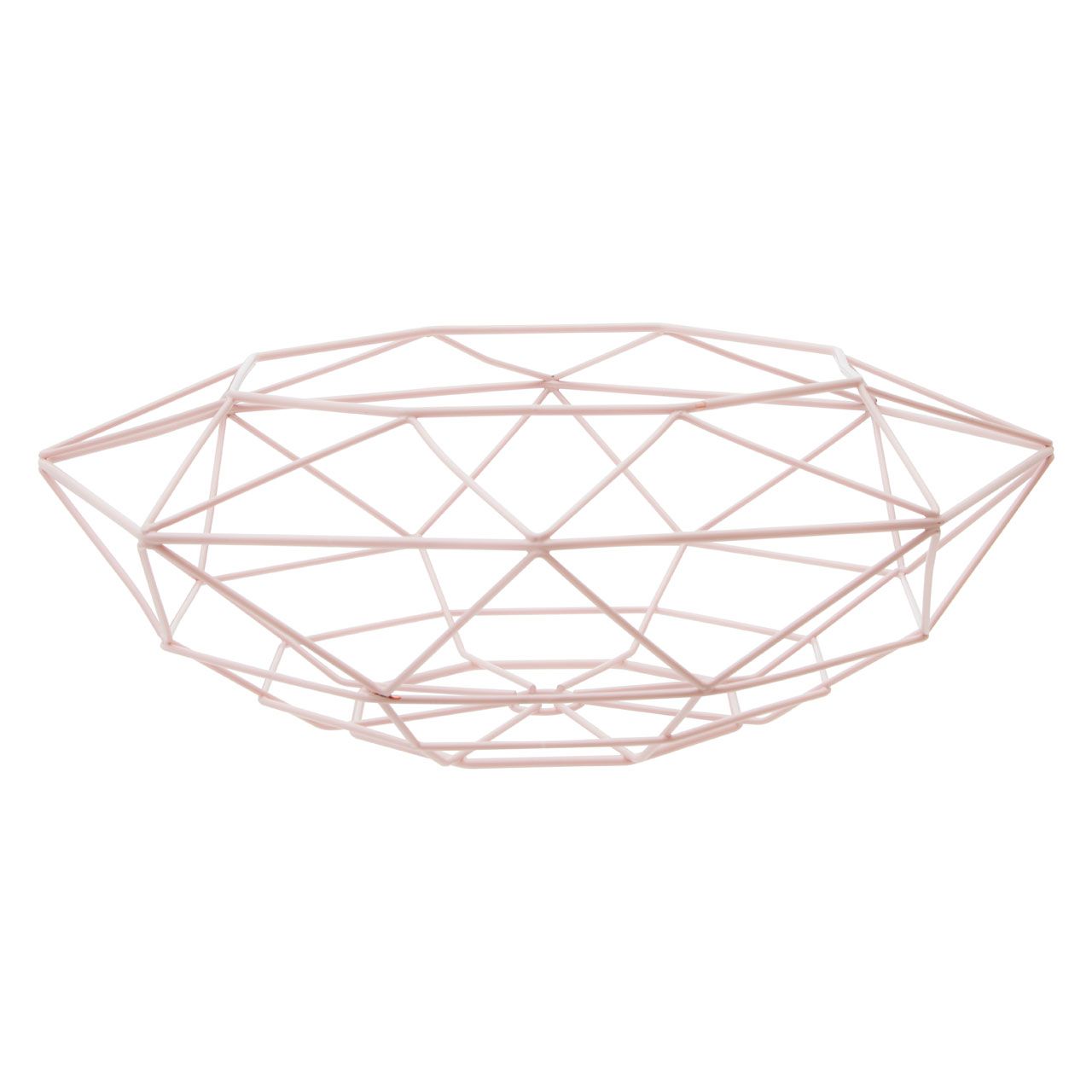This contemporary fruit basket uses slim wires to create a distinctive geometric lattice. Made from strong iron, the Vertex fruit basket's minimalist wireframe construction boasts a bright pink finish. The geometric design results in two layers of triangles that combine to form a polygonal bowl shape. The tapered design allows it to hold fruit securely. Small rounded feet raise the fruit bowl from the surface of the table or worktop.