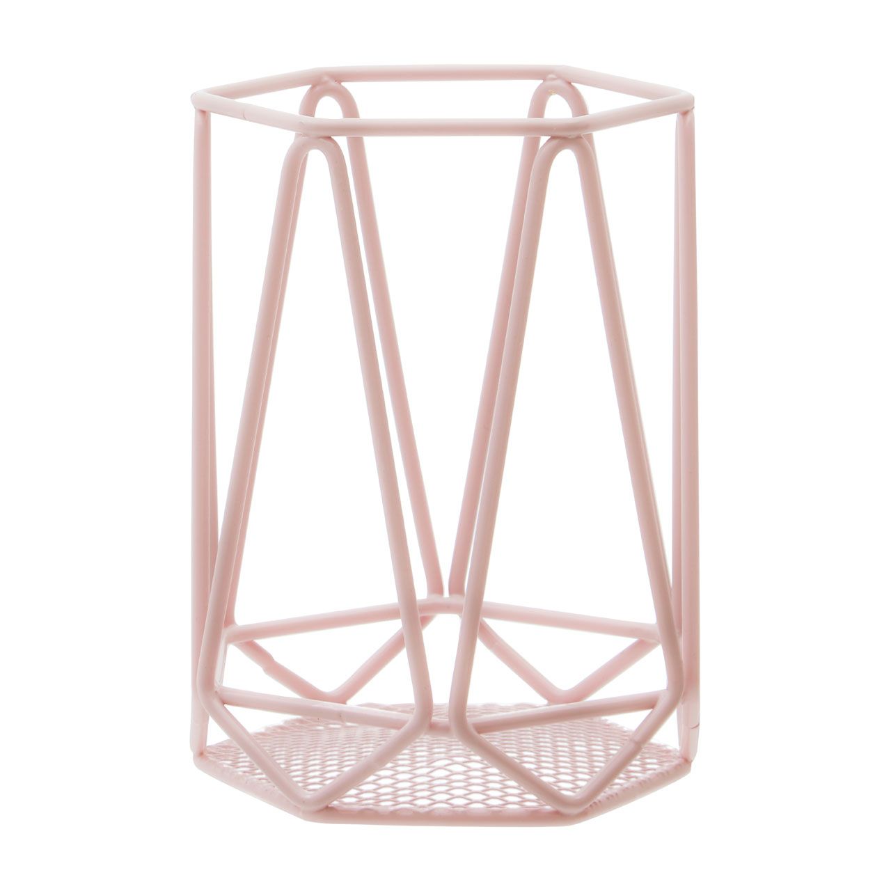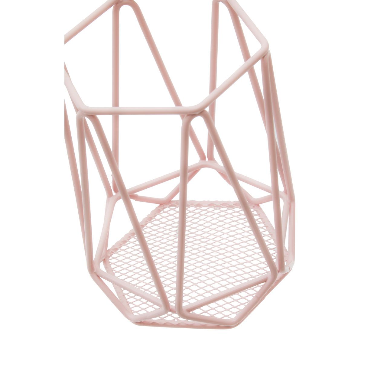 Make a geometric statement with the contemporary Vertex iron wire utensil holder. Keep kitchen utensils neat and organised with this stylish utensil holder. Its strong iron frame forms a hexagon, the geometric symmetry continuing with the kite shaped pattern on its sides. The pink plated finish creates a warm impression, while the strong mesh base ensures that utensils remain secure.