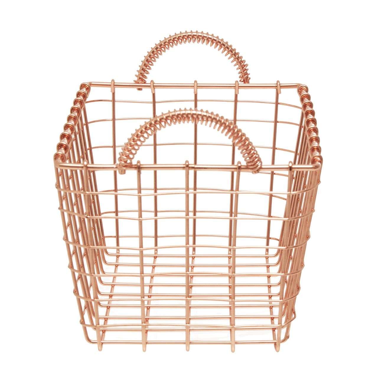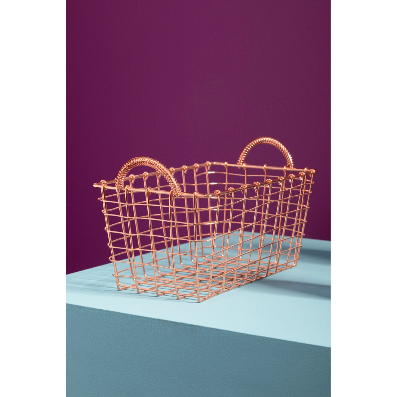 A perfect storage solution, this basket is ideal for keeping books, magazines and toys organised. Constructed from copper finish iron, this rectangular basket has vertical and wavy lines that combine to form its sleek wireframe. The basket has dual side handles with a matching spiral detail on them creating a decorative aesthetic.